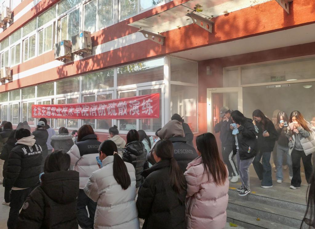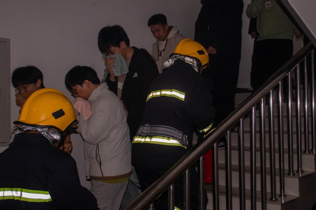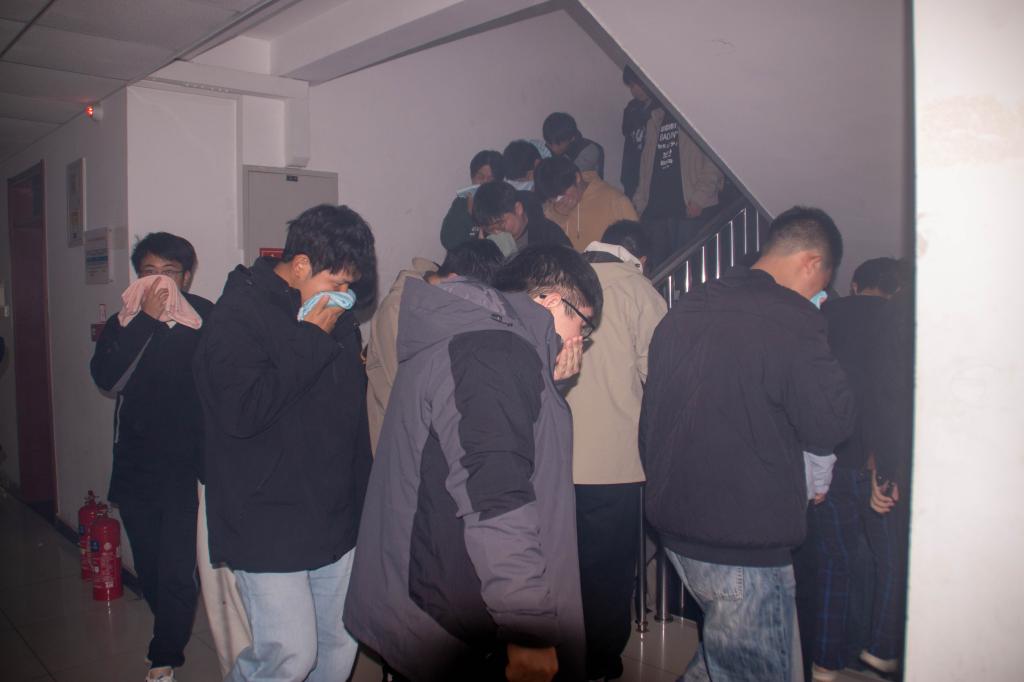 演练模拟学生宿舍楼发生火情。演习当日,随着王颖副院长一声令下,消防应急疏散预案立即启动。宿管员发现火情后迅速上报,中控室同步响应,疏散组组织学生沿安全通道有序撤离,灭火组迅速使用消防器材控制火势。在模拟浓烟环境中,同学们掩住口鼻、弯腰低姿,快速转移至室外安全区域。微型消防站队员同步搜救滞留人员,警戒组维持现场秩序。整个过程反应迅速、配合紧密,在规定时间,所有人员安全疏散,演练顺利结束。