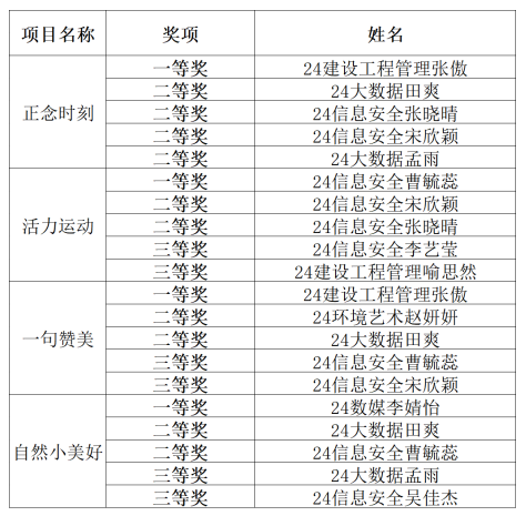 为期21天的打卡活动,有效帮助学生缓解压力、改善睡眠状态、强化社会支持、养成坚持自律习惯,实现了从“被动参与”到“主动成长”的转变。经积分统计,共评选出20项奖项,并对相关获奖学生予以公示表彰。